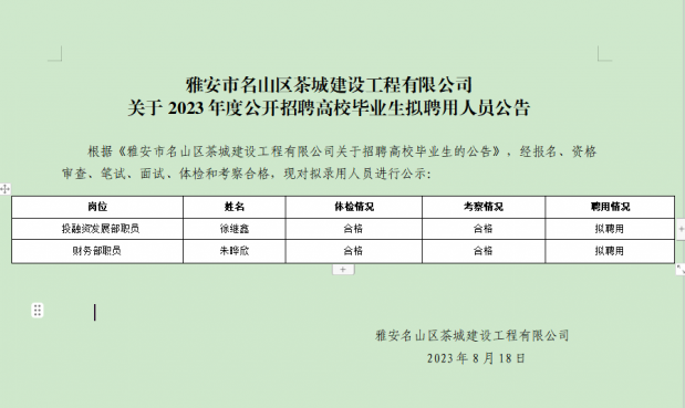 雅安市名山區茶城建設工程有限公司關于2023年度公開招聘高校畢業生擬聘用人員公告